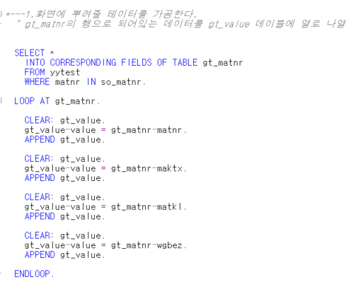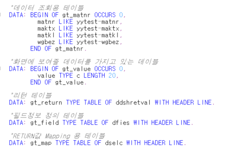 조회화면에 보여지는 데이터를 읽어오는 펑션 에 대해 알아보겠습니다. DATA: lt_dynpfields TYPE TABLE OF dynpread WITH HEADER LINE. CALL FUNCTION 'DYNP_VALUES_READ' EXPORTING..