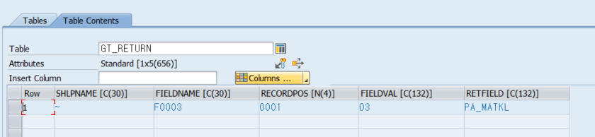 GT_RETURN 값을 살펴보면 RETFIELD값 에 PA_MATKL이 있으므로 POPUP 데이터 클릭시,