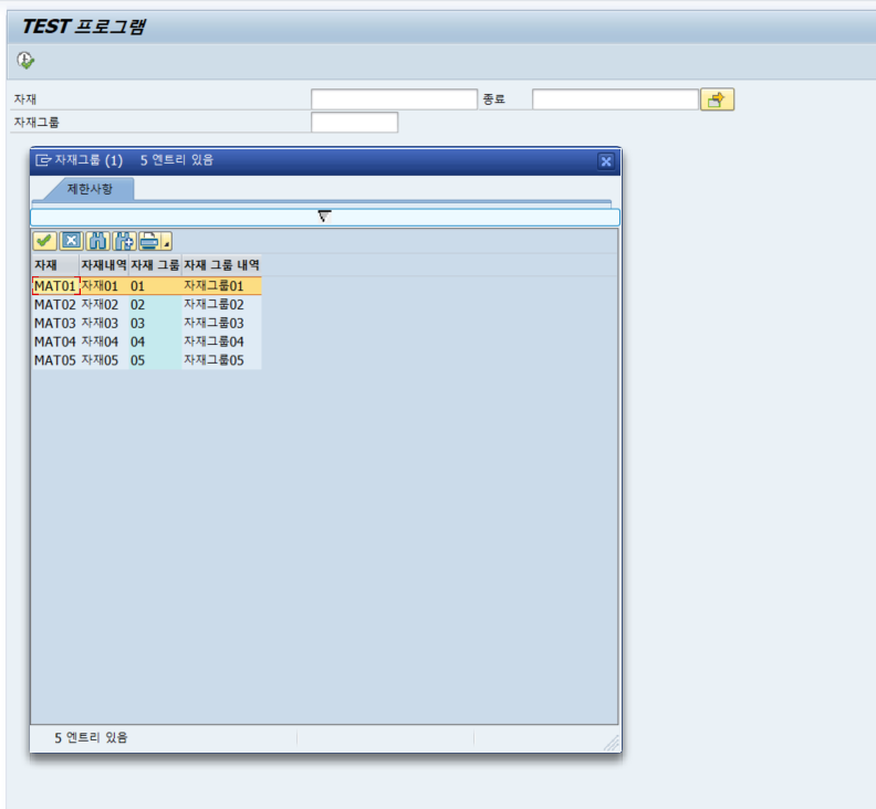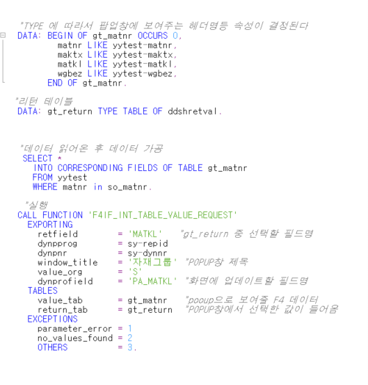 YYTEST라는 테이블에서 SO_MANTR 을 조건으로 데이터를 조회하여 search help를 보여준 후