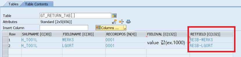 (**참고2) dynprofield 값을 입력하면 return_tab-retfield 에 값이 들어가며