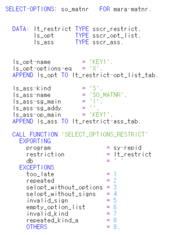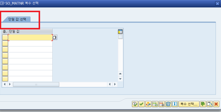 아래 예시는 so_matnr 의 option중 EQ (단일값 선택) 만 사용 가능하게 설정한것이다.